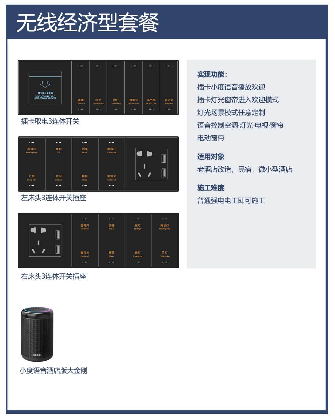 方案導(dǎo)讀:智慧酒店解決方案優(yōu)勢(shì)在于零布線,不停業(yè),少換新,適用于老酒店改造,民宿,微小型酒店。以下兩種套餐適用于各種類型酒店智能配套僅供參考。